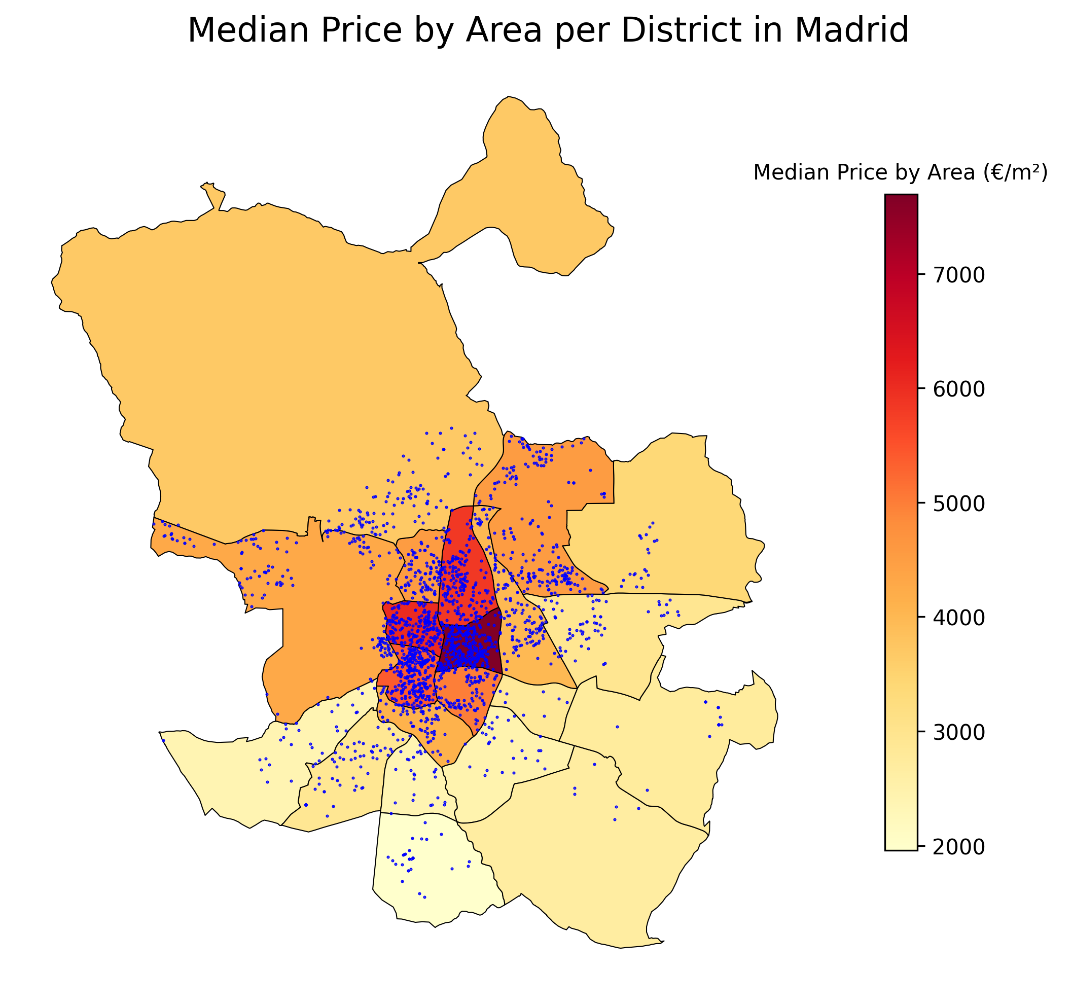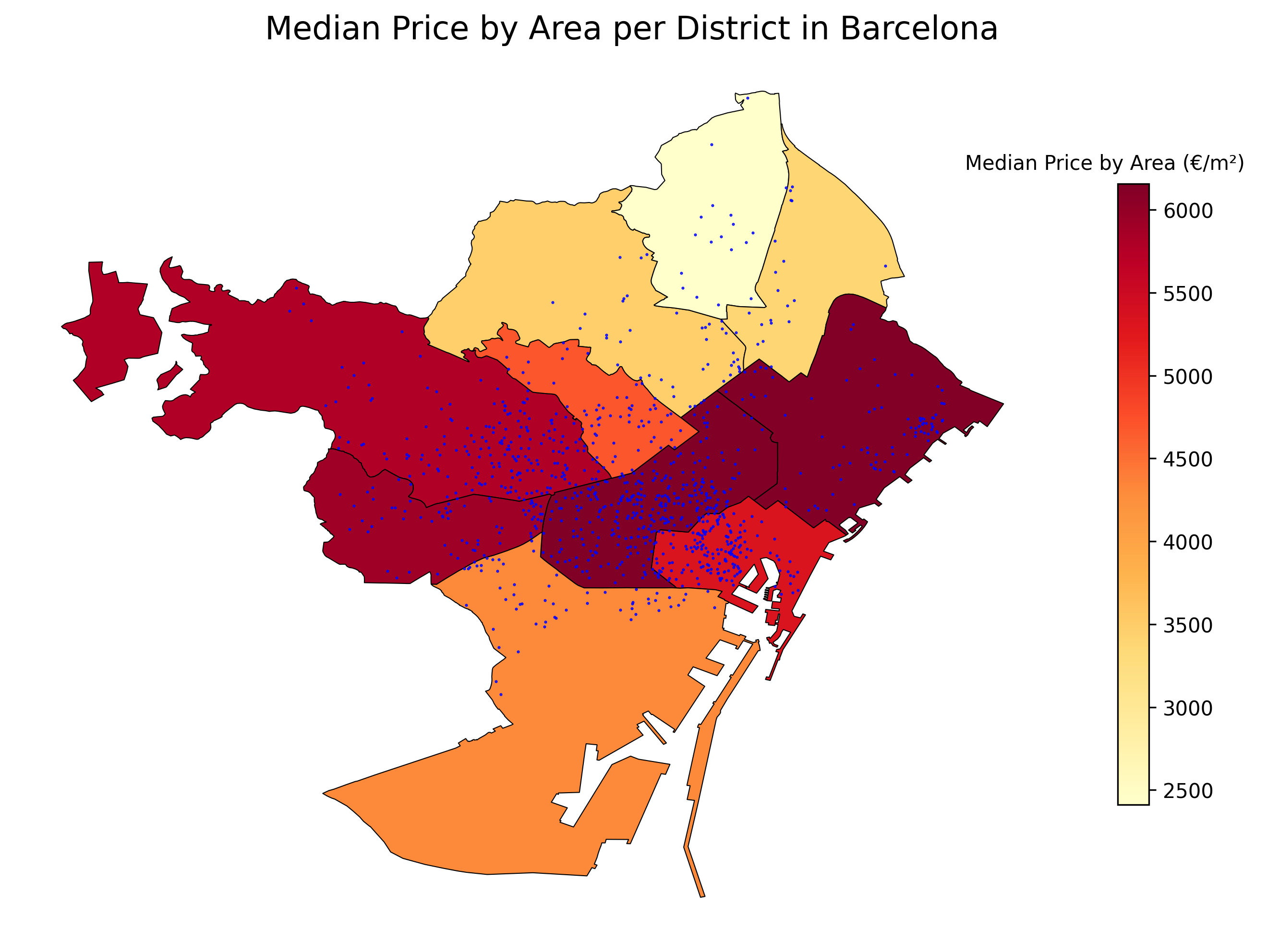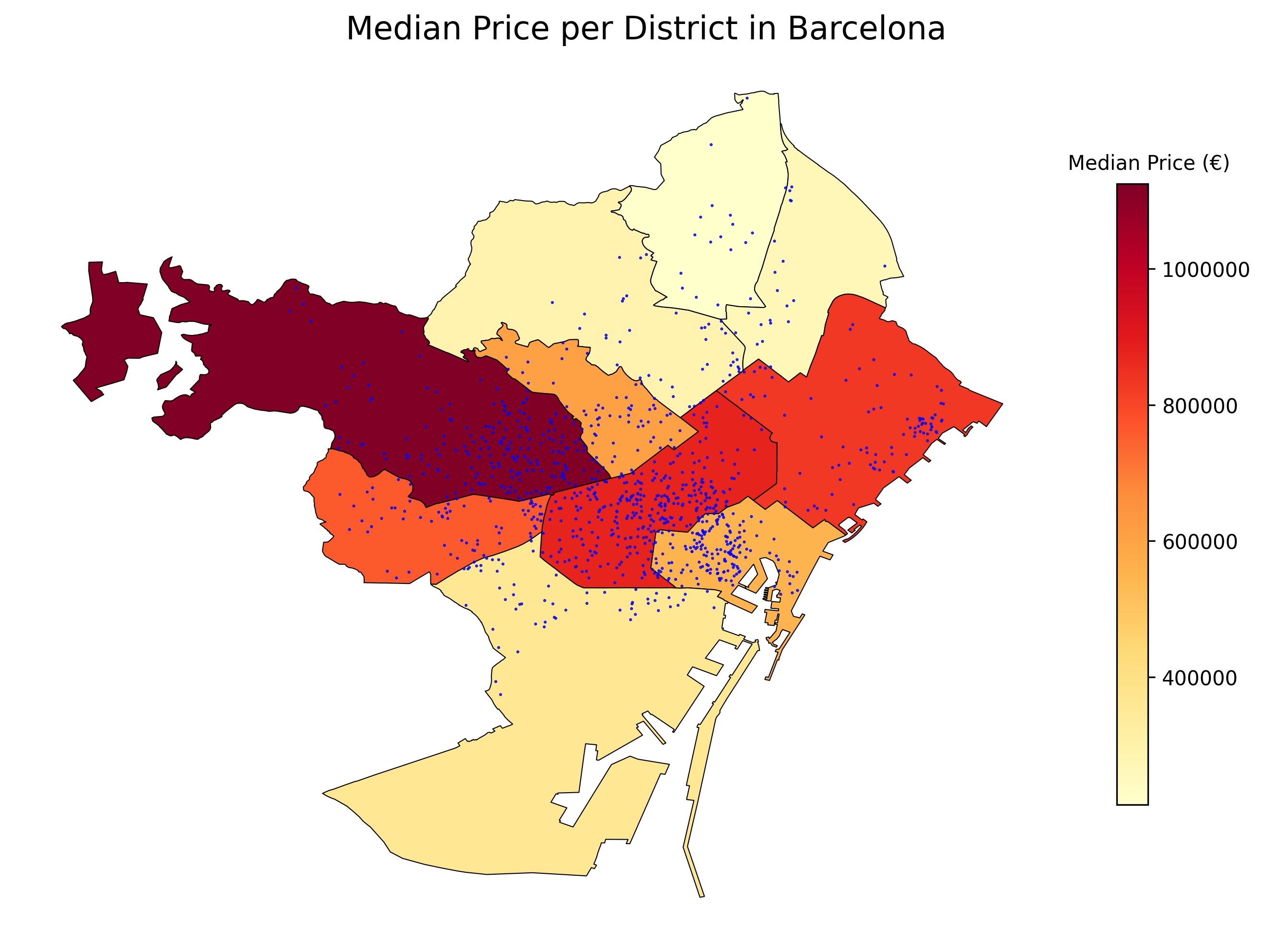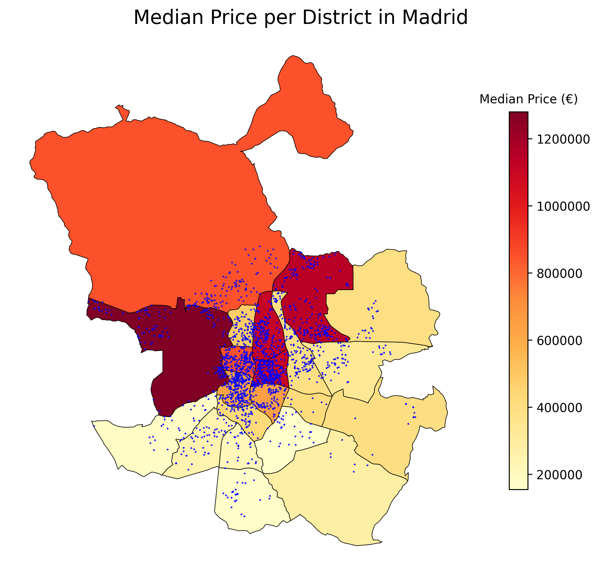In this section, we focused only on properties within the districts of Madrid and Barcelona. According to government organisation, Madrid has 21 districts while Barcelona has 9 districts. We obtained the shapefiles from the muncipality websites of the cities, and ran a spatial join between the shapefile and the idealista datasets by utilising the Geopandas library. This was possible because each individual property listing on idealista provides exact longitude and latitude of the property. In total, we managed to produce four heat maps indicating the median price and median price by area for the districts in Barcelona and Madrid.