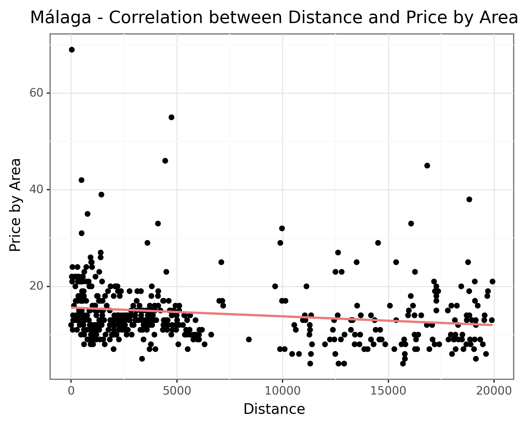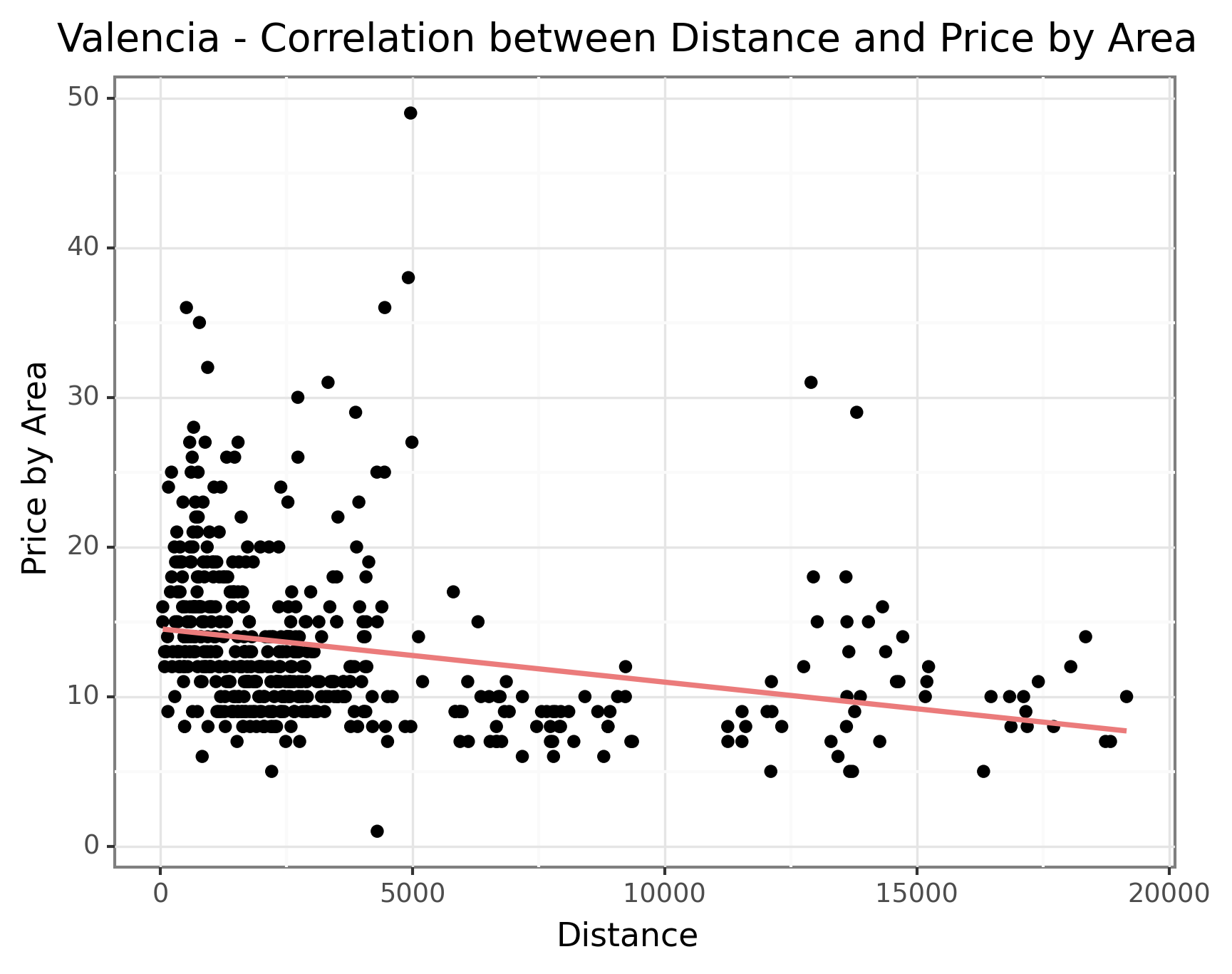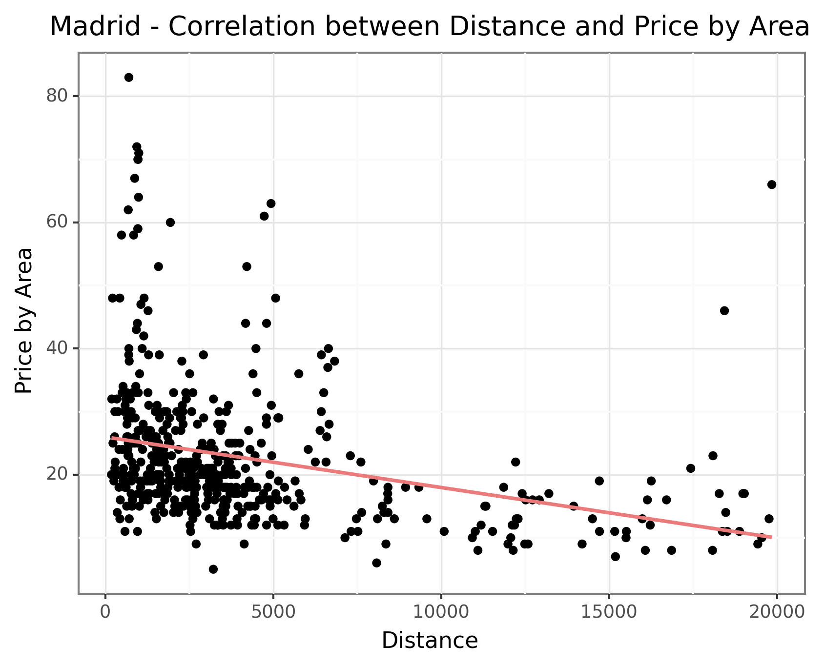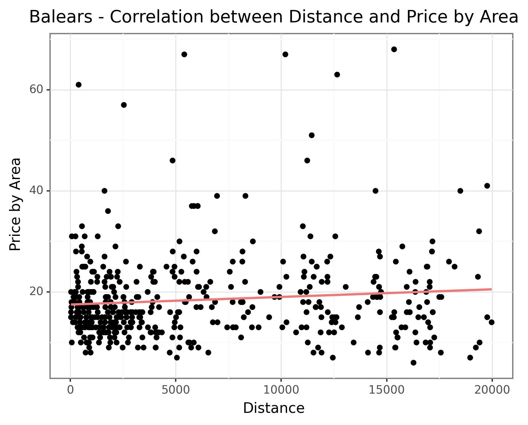 However, Balears (Palma) stands out as an exception as seen in the the below graph. The rental properties in Palma display a slightly positive correlation between distance and price. This anomaly could be attributed to the fact that the Balears comprise of many islands, resulting in less developed infrastructure in the city center which causes a lower correlation. Another possible reason could be the unique demand dynamics in Balears. Being a popular tourist destination, the demand for residential properties in Palma might be influenced by factors such as proximity to beaches, amenities, and tourist attractions rather than solely based on distance from the city center. This distinctive demand pattern could lead to a different price relationship compared to other cities where distance from the city center plays a more prominent role. However, without more detailed information, we are unable to draw any definitive conclusions about the data in Palma. Nevertheless, this insight provides valuable information for understanding the pricing dynamics across different cities, emphasizing the influence of population density and geographical factors on residential property prices.