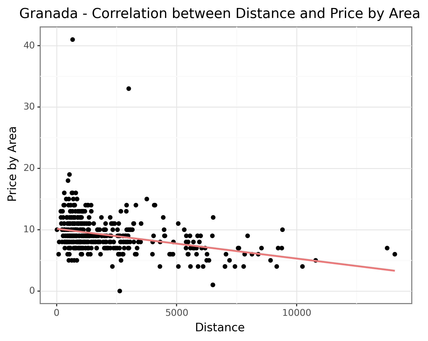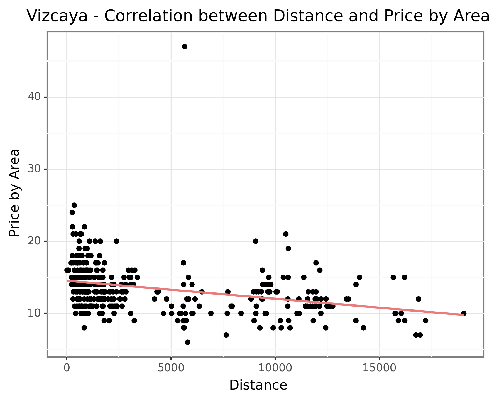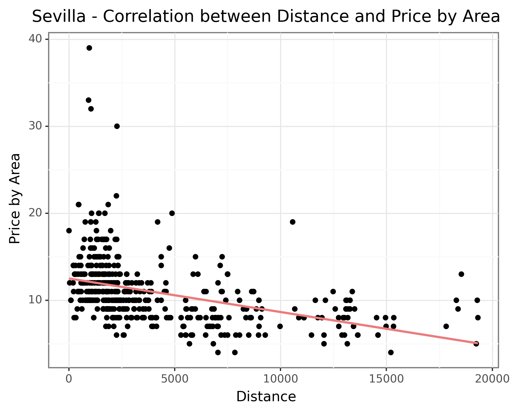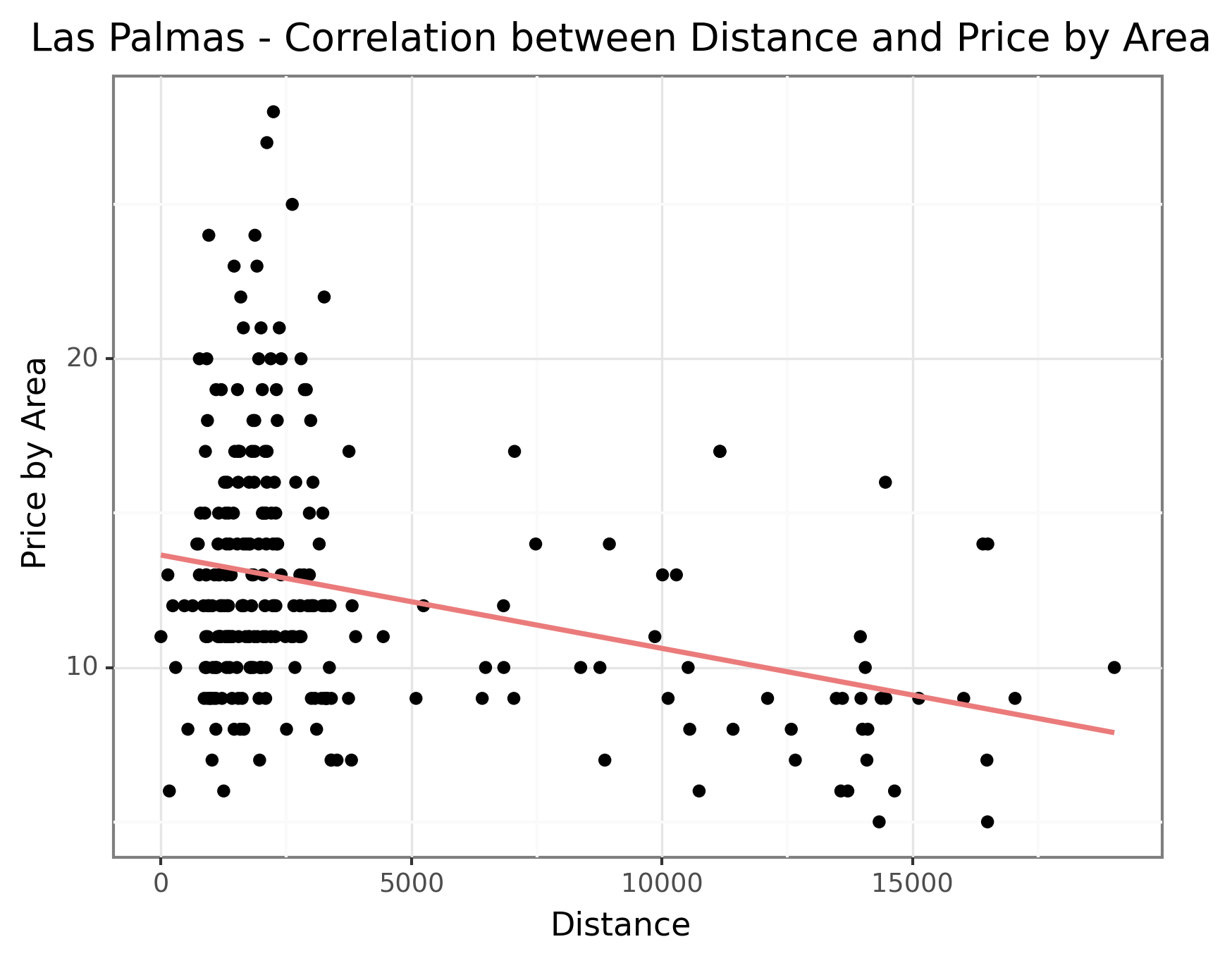 However, Balears (Palma) stands out as an exception as seen in the the below graph. The rental properties in Palma display a slightly positive correlation between distance and price. This anomaly could be attributed to the fact that the Balears comprise of many islands, resulting in less developed infrastructure in the city center which causes a lower correlation. Another possible reason could be the unique demand dynamics in Balears. Being a popular tourist destination, the demand for residential properties in Palma might be influenced by factors such as proximity to beaches, amenities, and tourist attractions rather than solely based on distance from the city center. This distinctive demand pattern could lead to a different price relationship compared to other cities where distance from the city center plays a more prominent role. However, without more detailed information, we are unable to draw any definitive conclusions about the data in Palma. Nevertheless, this insight provides valuable information for understanding the pricing dynamics across different cities, emphasizing the influence of population density and geographical factors on residential property prices.